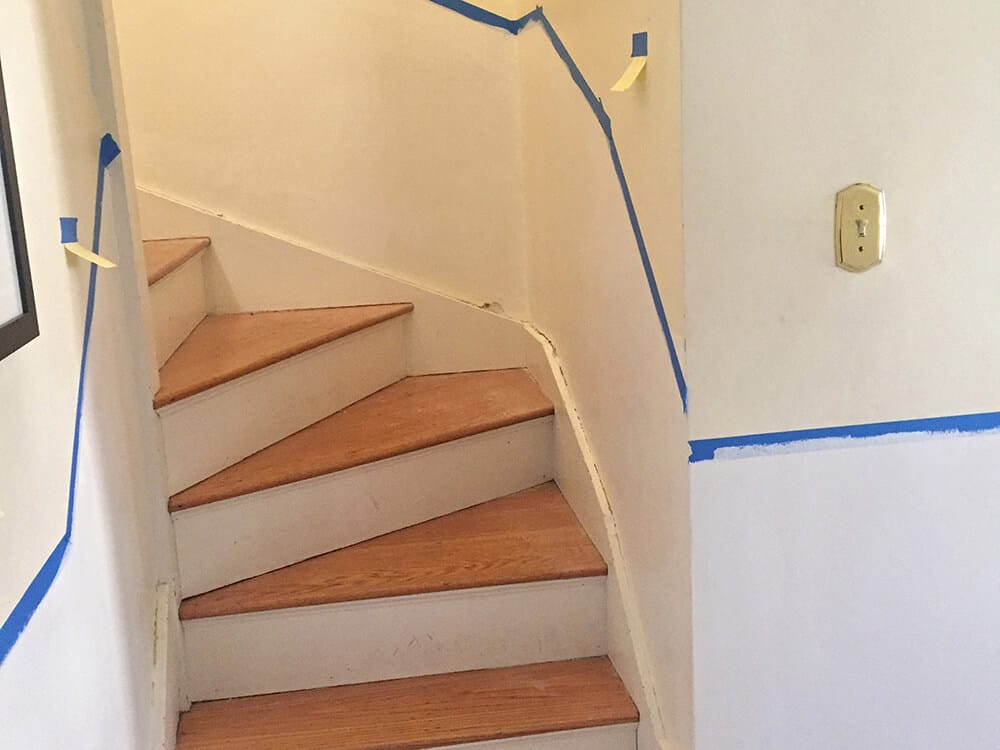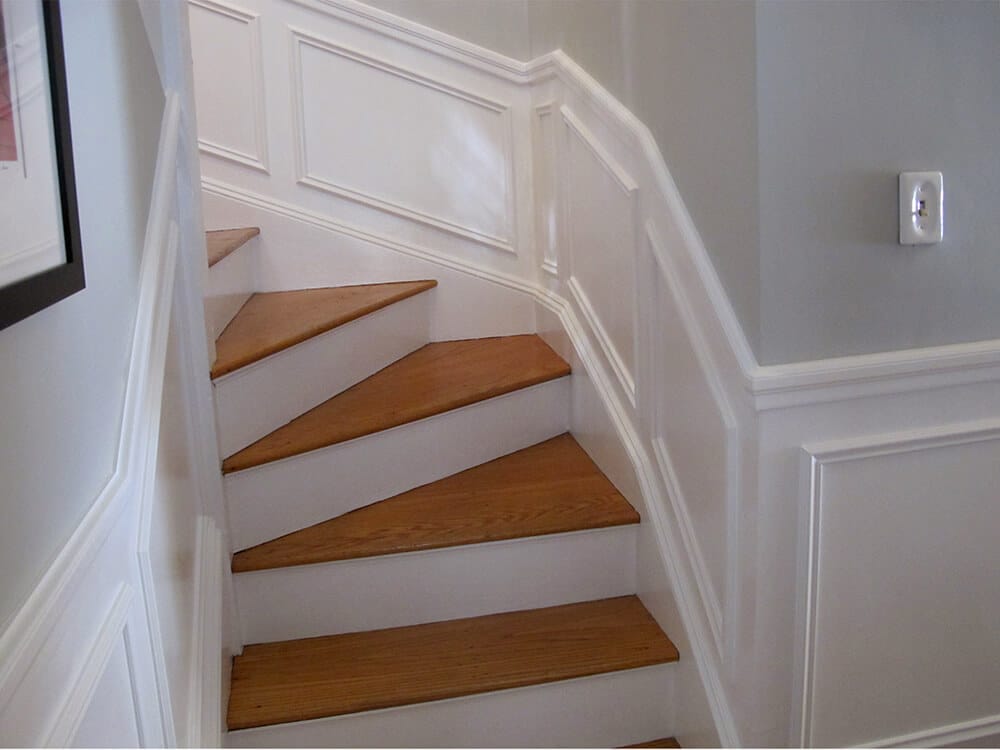 The hall and stairway in this home were featureless. The owner asked us for ideas as to how to give it some character. We proposed using moldings to create a faux wainscoting. Layout and proportions were critical in creating a pleasing appearance. At the stairs, the continuously changing pitch of the steps made this job particularly challenging.